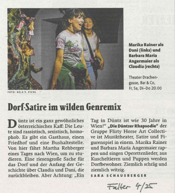 “Die Düntzer Rhapsodie” ist eine interdiziplinäre Sprechtheateraufführung. Ihre Idee entstand im Rahmen der Bewerbung für den Nachwuchswettbewerb am Theater Drachengasse und als Reaktion auf das ausgeschriebene Thema “Stadtplan oder Wanderkarte”. Die Aufführung thematisiert die komplizierten Beziehungen zwischen Land und Stadt in Österreich. Sie diskutiert wichtige und gesellschaftlich relevante Themen wie Gleichberechtigung, Diversität, Menschenrechte und sendet eine Botschaft gegen häusliche Gewalt, Homofobie und Diskriminierung.